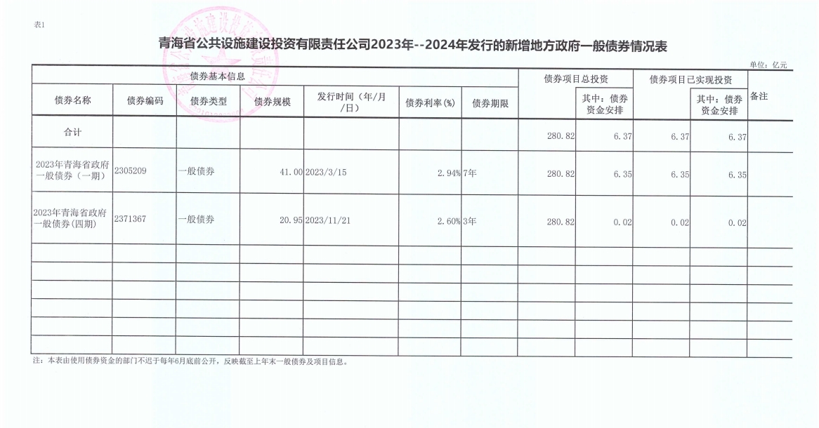 青海省公共設(shè)施建設(shè)投資有限責任公司2023年--2024年發(fā)行的新增地方政府一般債券情況表